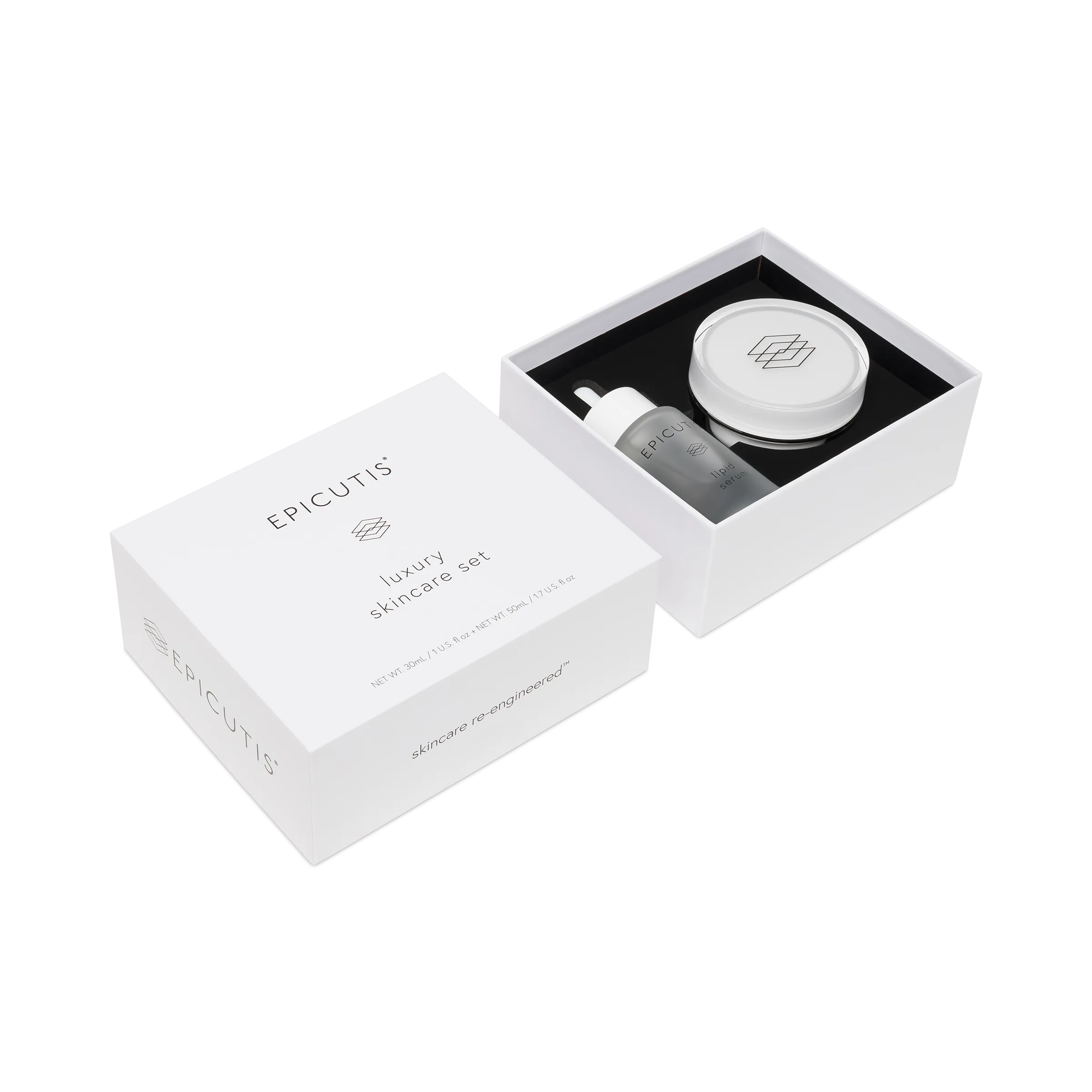 The Luxury Skincare Set combines two powerful steps — Treat and Hydrate — with the Lipid Serum and Hyvia® Crème, both formulated with patented active ingredients exclusive to Epicutis®. Lipid Serum With only eight ingredients, this silky serum is a must-have in any healing routine. It contains therapeutic concentrations of TSC, a patented anti-inflammatory compound, to deliver instant relief for dry, stressed, sensitive, or post-procedure skin. With continued use, it also provides proven long-term benefits that support healthier, more resilient skin. Hyvia® Crème This rich moisturizer is powered by three proprietary ingredients combined with pure, responsibly sourced botanicals. Hyvia®, derived from organic non-GMO chia seed oil, delivers deep hydration while protecting against blue light damage. DSD technology adds an extra layer of defense against environmental aggressors, including UV exposure, for smoother, healthier-looking skin.